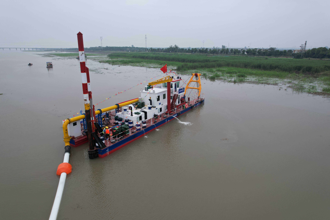 Ответ: Это небольшое судно для выкачки песка изготовлено в Китае.